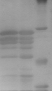 我想用肠激酶切去蛋白的组氨酸标签,结果除了得到我要的条带以为还得到了好多非特异条带,并且原来的条带总是切不完全,图上第一条带是原来没有切割的蛋白,第二条可能是我需要的切完的条带,下面那些就是不需要的非特异切割。试过加入尿素,改酶切温度和时间,离子浓度,都没有效果,广大虫友又没有好办法提高切割特异性,若能让原来的蛋白完全切割也行,本人感激不尽