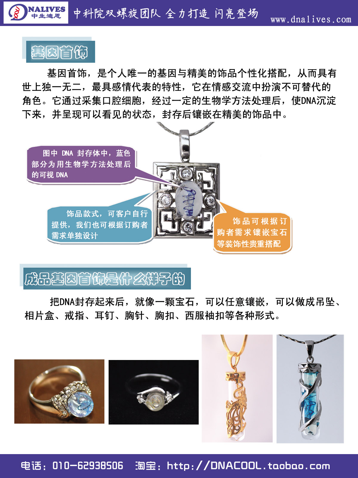 中科院研究生院双螺旋团队基因饰品项目组,创立DNALIVES品牌,开创饰品与生物结合的先河,带您走进生命科学的世界。它将会是奇妙的体验,全新的感受。 我们的团队将秉承DNALIVES的宗旨:关注生命质量,创造生活希望! 基因饰品是将个人基因载入饰品中,使个体基因的唯一性与饰品的装饰性完美结合,我们称之为“看得见的DNA”或“生命信息挂件”。 每一个人的DNA都是独一无二的,它将会成为世界上最具代表性的礼物,本产品可使你无任何负担地从口腔细胞中提取出自己、家人、朋友或爱人的DNA,包括宠物的DNA,并可将提取的DNA载入项链、戒指、吊坠及其他可装饰性物件中永久保存,由此,该DNA中的全部生命遗传信息得以珍藏。 DNA采集步骤简单,在采集过程中就开始实行独立编码体系,保证产品的唯一有效性。 双螺旋团队 www.dnalives.com http://dnacool.taobao.com |
