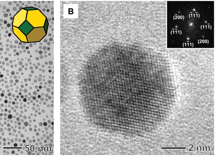 | 这个是单晶的颗粒,是没有孪晶面的。其实这种颗粒的形状判断是很简单的。一般来说,人们都认为具有类球形的单晶常见纳米颗粒是截角八面体的。楼主的颗粒我没有记错的话,应该是xia younan 发在science的Pd纳米颗粒,这类贵金属纳米颗粒最为典型,这种形状的一般来说是截角八面体,就是他说的truncated octadhedron,就是八个{111}晶面和6个{100}晶面包裹而成的,简单说就是一个八面体,把六个角截掉,这个是别人高分辨验证过的。你心中有这一个模型,其实一切都简单了,他说的那个沿着什么晶带轴入射的方向,是根据FFT计算出来的,其实如果是电镜高手和熟悉自己颗粒的模型,一下子就能看出来是沿着什么晶带轴入射的。一般来说,这种颗粒在铜网上,要么是一个{111}面平行铜网上的carbon film面,要么一个{100}面平行铜网上的carbon film,就比如一个截角八面体滚动,总会有一个平面最后和地接触,而不是一个棱和地接触一样,所以这样来说电子束沿那个晶带轴的入射就很容易判断了,颗粒的形状和摆放位置也就很好判断了。 |