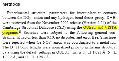 请问如果用CCDC检索时,想检索NO3离子与其他H受体所形成的氢键文献,该怎样检索,看到JACS中有段话,说是用 QUEST and VISTA programs可以,不知道怎么检索? JACS文献在附件中 |