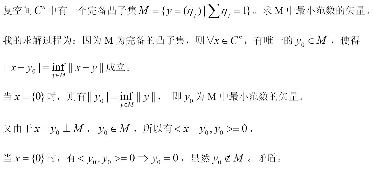 求教复空间中完备凸子集最小范数的矛盾问题?请教大虾