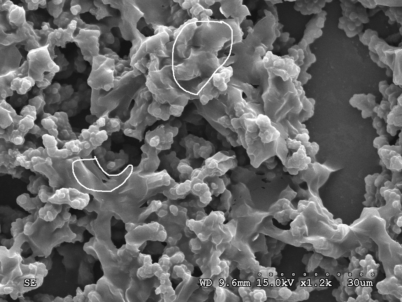 不知道你这是什么样品,不过你说你的应该是核壳结构,那么有没有可能就是有的形成了核壳微球,有的,没有形成微球,而是形成融成一片膜状物呢。我也建议你试试TEM,通过染色,可以很清楚的看见核壳结构。