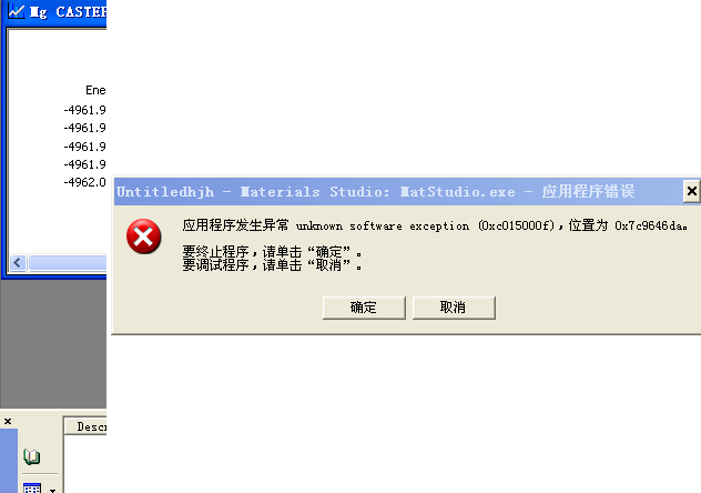 meterials studio 5.5在计算时,尤其是在计算后点击某一计算结果(例如点击能量的计算结果)总出现应用程序错误对话框,无论点击确定还是取消,都把这个软件给直接的关闭了,求助,这是怎么回事,急急急!!! [ Last edited by cenwanglai on 2011-10-14 at 09:12 ] |