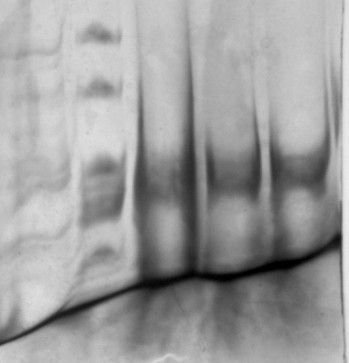 我是按照TCA/丙酮沉淀方法,提取总蛋白用来跑双向的,跑双向之前,先用SDS-PAGE,检测了下蛋白质量,但是看到这张图,我不知道该怎么办,请大家帮忙分析下啊,图上的右边3个,为蛋白样品,右边第4为Marker泳道