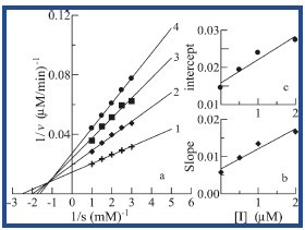 求问下面这个图,如何用斜率得到KI,用截距得到KIS,还有这两个指标在酶动力学中能说明什么问题?如果有什么好的书或者资料有相关说明,还请推荐下,非常感谢