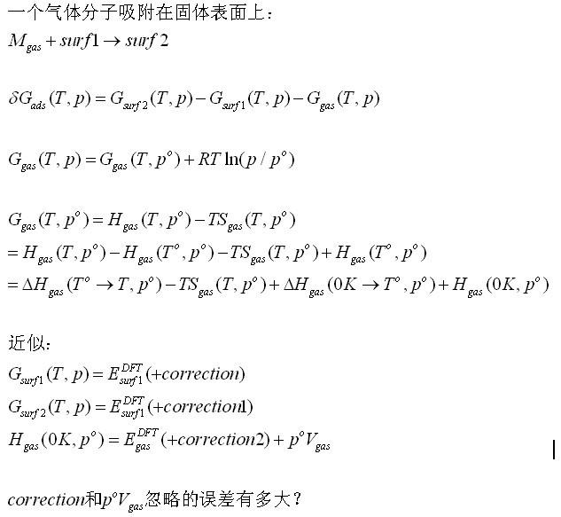 看看这个,请指正,并评估这样做的误差。 一篇JACS定义Egas=0,然后说Hgas(0,Po)=0; http://muchong.com/bbs/viewthread.php?tid=3695520 上面链接附件中还有一篇PRB则定义Gads(0K,p0)=0,得到Hgas(0K,p0)=0。 另外一篇JPCC则把Egas包含进去,认为Hgas(0,p0)=Egas. 感谢dwma提供经典原始参考文献一篇:Ab Initio Atomistic Thermodynamics for Surfaces: A Primer by Jutta Rogal and Karsten Reuter[ Last edited by cenwanglai on 2011-10-23 at 20:19 ] |