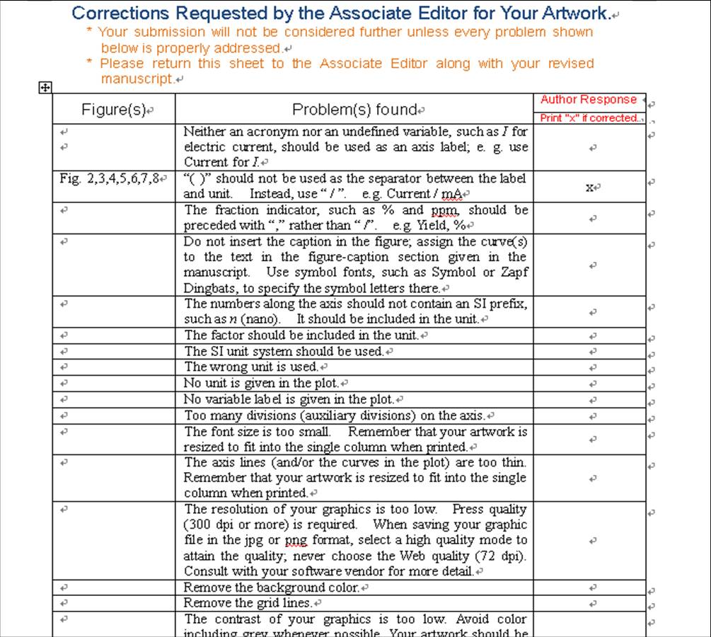 各位大侠,有没有投稿过analytical sciences 的,小弟现在投了一篇,发回修改,审稿人对文中的一些图片表格指出了一些问题,叫我修改。编辑列了一个表格,列举了很多的问题,但是只是在一条问题的前面把我的图片列出来了,看不懂这个是怎么回事啊,不知道是不是表中所列的问题我的图片都有还是别的,求指导。 附上截图,请参考。 表格截图 |