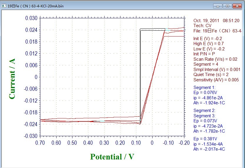 我的溶液是0.01mol/L的铁氰化钾+0.01mol/L的亚铁氰化钾+0.01mol/L的KCl,工作电极和辅助电极都是铂电极,参比是甘汞电极。电极用酸洗然后用乙醇洗过。我每次做出来的曲线都差不多这个样子。没峰。祈求各位大侠高手能给个解决办法,感激涕零。小弟现在都快哭了!急啊。