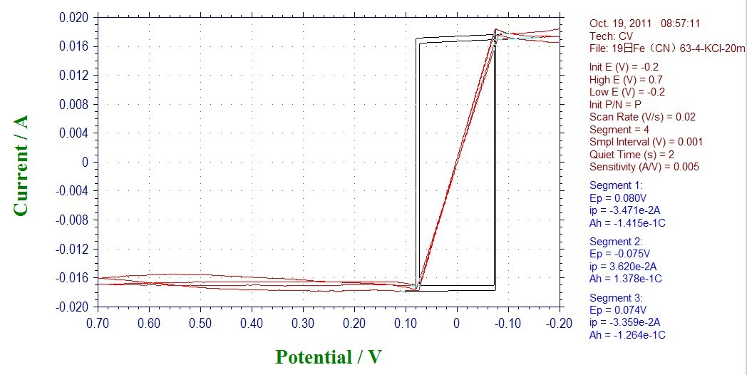 我的溶液是0.01mol/L的铁氰化钾+0.01mol/L的亚铁氰化钾+0.01mol/L的KCl,工作电极和辅助电极都是铂电极,参比是甘汞电极。电极用酸洗然后用乙醇洗过。我每次做出来的曲线都差不多这个样子。没峰。祈求各位大侠高手能给个解决办法,感激涕零。小弟现在都快哭了!急啊。 1 2 |