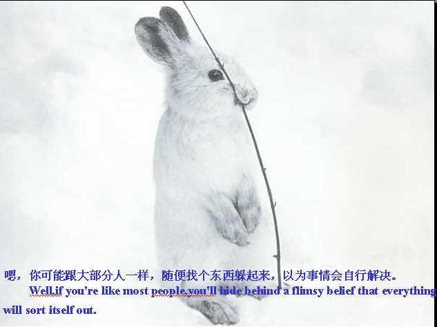 这是我在教学课间休息的10分钟播放的一款关于动物感悟人生的ppt,学生反映还不错,特拿出来与大家分享。缺陷就是图片底色都是黑白的,部分文字是我加上去的。当然,也适合做科研的虫子实验之余轻松放松一下。希望大家不吝评价! [ Last edited by anyluk on 2012-2-29 at 18:42 ] |