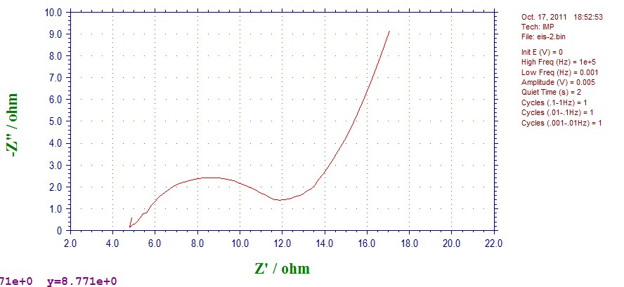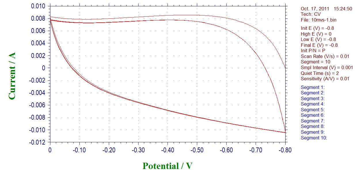 用活化过的活性炭做电极,BET为2650m2g-1。3电极体系测试,用恒流充放电计算比电容,在100mAg-1扫速下比电容为460Fg-1。可是为什么我用循环伏安去扫的时候,电流不是很大,算出来的比电容也只有170Fg-1多一点。这是为什么? 下面是我附的图。 还有就是我的EIS比其它活性炭会大很多,这是为什么? GC-100mAg-1 EIS CV-10mVg-1 |