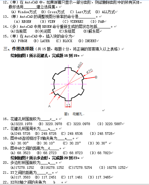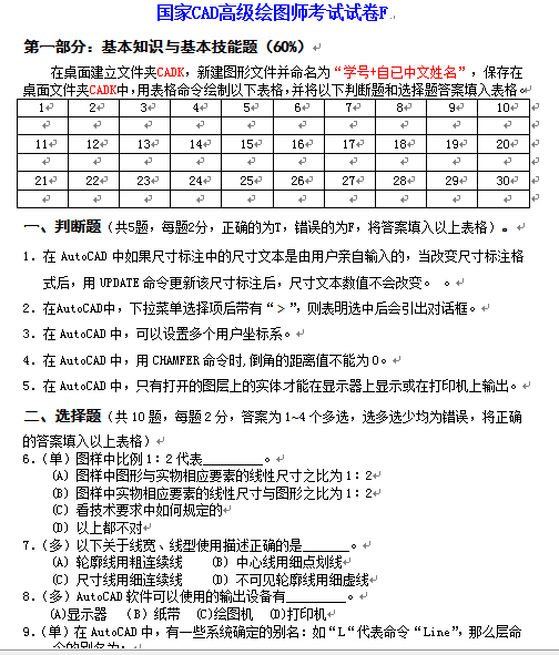 国家CAD高级绘图师考试试卷F 第一部分:基本知识与基本技能题(60%) 在桌面建立文件夹CADK,新建图形文件并命名为“学号+自已中文姓名”,保存在桌面文件夹CADK中,用表格命令绘制以下表格,并将以下判断题和选择题答案填入表格。 一、判断题(共5题,每题2分,正确的为T,错误的为F,将答案填入以上表格)。 1.在AutoCAD中如果尺寸标注中的尺寸文本是由用户亲自输入的,当改变尺寸标注格式后,用UPDATE命令更新该尺寸标注后,尺寸文本数值不会改变。 。 2.在AutoCAD中,下拉菜单选择项后带有“ ”,则表明选中后会引出对话框。 3.在AutoCAD中,可以设置多个用户坐标系。 4.在AutoCAD中,用CHAMFER命令时,倒角的距离值不能为0。 5.在AutoCAD中,只有打开的图层上的实体才能在显示器上显示或在打印机上输出。 [ 来自科研家族 梦家园 ] [ Last edited by flmzxj on 2011-10-23 at 14:12 ] |