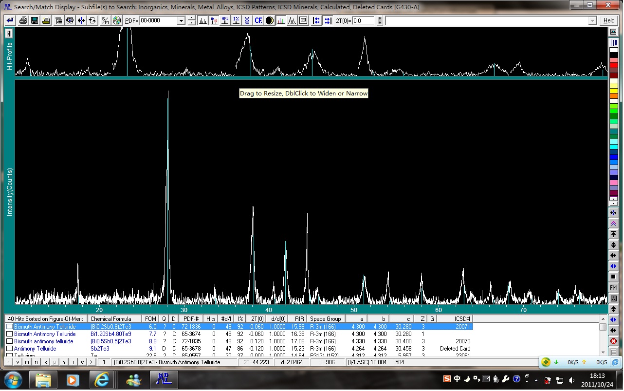 经分析,只能匹配Bi0.5Sb1.5Te3大部分峰。70°以上的3个峰找不到。