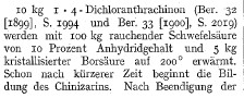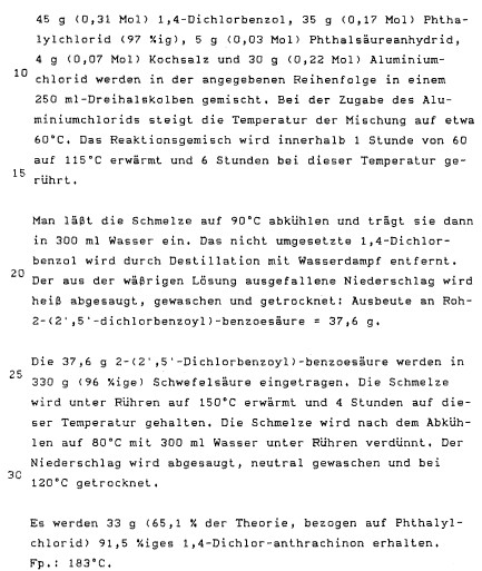 Beispiel 1. 10 kg 1,4 - Dichloranthrachinon werden mit 100 kg rauchender Schwefelsäure von 10 Prozent Anhydridgehalt und 5 kg kristallisierter Borsäure auf 200 ¡æ erwarmt. Schon nach k¨¹rzerer Zeit beginnt die Bildung des Chinizarins. Nach Beendigung der Reaktion gießt man die Schmelze in wasser£¬f¨¬ltriert und wäscht neutral. 45g (0.31 Mol) 1,4-Dichlorbenzol, 35 g(0 .17 Mol) Phthalylchlorid (97%ig) , 5g (0.03Mol) Phthalsäureanhydrid ,4 g (0 ,07 Mol) Kochsalz und 30 g (0 .22 Mol) Aluminium-chlorid werden in der angegebenen Reihenfolge in einem 250ml Dreihalskolben gemischt. Bei der Zugabe des Aluminiumchlorids steigt die Temperatur der Mischung auf etwa 60 ¡æ. Das Reaktionsgemisch wird innerhalb 1 stunde von 60 auf 115 ¡æ erwärmt und 6 stunden bei dieser Temperatur ger¨¹hrt. Man läßt die schmelze auf 90¡æ abk¨¹hlen und trägt sie dann in 300 ml Wasser ein. Das nicht umgesetzte 1, 4-Dichlorbenzol wird durch Destillation mit Wasserdampf entfernt. Der aus der wäßrigen Lösung ausgefallene Niederschlag wird heiß abgesaugt, gewaschen und getrocknet ;Ausbeute an Roh-2-(2' ,5'-dichlorbenzoyl)-benzoesäure = 37 ,6 g. Die 37.6g 2-(2',5'-Dichlorbenzoyl)-benzoesäure werden in 330g (96%ige) schwefelsäure eingetragen. Die Schmelze wird unter R¨¹hren auf 150 ¡æ erwärmt und 4 stunden auf dieser Temperatur gehalten. Die Schmelze wird nach dem Abk¨¹hlen auf 80¡æ mit 300 ml Wasser unter R¨¹hren verd¨¹nnt. Der Niederschlag wird abgesaugt , neutral gewaschen und bei 120¡æ getrocknet. Es werden 33 g (65.1 % der Theorie , bezogen auf Phthalylchlorid) 91.5% iges 1,4 -Dichlor-anthrachinon erhalten. [ À´×Ô¿ÆÑмÒ×å É¼Ò×å ] |