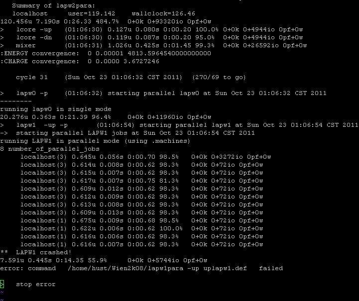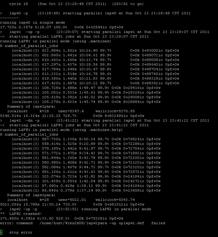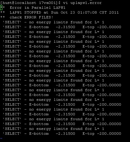wien2k运行在两种情况下都出错了,请高手指点! 第一种情况:附图,好像是并行问题,单位和前十多步没问题呢,又不想并行设置问题,不知所措! 第二种情况:附图,能量从零点几直接跳到好几千,彻底看不懂了,希望高手解答啊! [ Last edited by hhp102 on 2011-10-25 at 11:47 ] |
