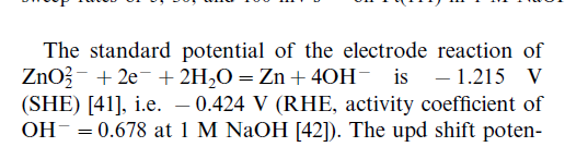 NATURE MATERIALS DOI: 10.1038/NMAT3087这篇里面给出来的 0.1 M KOH, E (RHE) = E (SCE) + 0.990 V. 1 M KOH, E (RHE) = E (SCE) + 1.051 V. 6 M KOH, E (RHE) = E (SCE) + 1.098 V. 我现在还查到了这些 Reference Electrode Electrolyte Shift to RHE Hg/HgO 1.0M KOH 0.93V Hg/HgO 0.1M KOH 0.87V Ag/AgCl 1.0M KOH 0.97V Ag/AgCl 0.5M KOH 0.95V Ag/AgCl 0.1M KOH 0.91V 还没找到Hg/HgO 6.0M KOH的。 相差0.04v,影响还是蛮大的吧? |