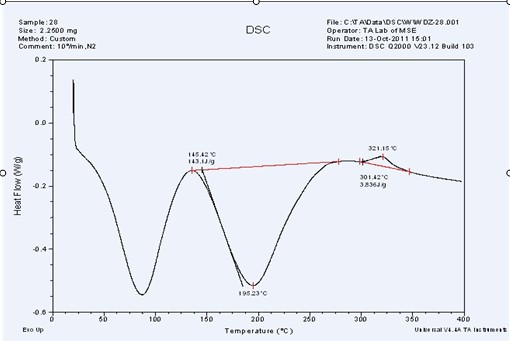 我当时是这么分析的::: 从这幅图可以看出,在90℃左右存在一个水的挥发峰,在195.23℃左右存在一个DMF溶剂挥发峰,321.15℃处为聚酰亚胺聚合物的玻璃化温度曲线。 可是老师有问题,请问哪位可以具体给分析下。(这是合成聚酰亚胺的第一步,生成聚酰胺酸,通过电纺成丝以后做的DSC曲线,DMF为溶剂) DSC图 |