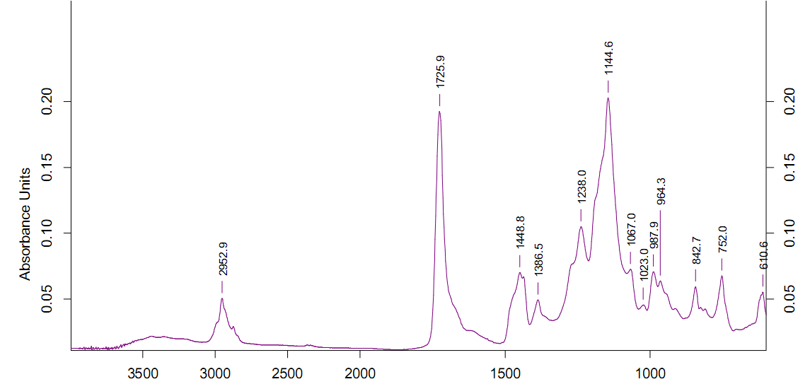 一直样品室丙烯酸酯类单体的共聚物,可能用到了多官能团的交联剂,不知道有没有苯环。 我自己的分析:2953 烷基峰 1726 羰基 1449,1387 烷基峰 但是之后的1238,1067,1023,998,964不知道怎么分析,尤其是1145的强峰究竟是什么,求指教? |