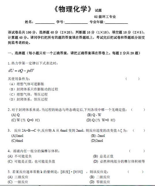 【试卷资源】物理化学期末试卷(四川大学)