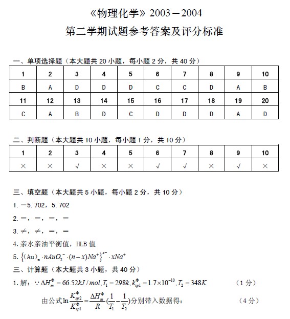 【期末试题】武汉大学 物理化学 期末考试 试题(汪存信)
