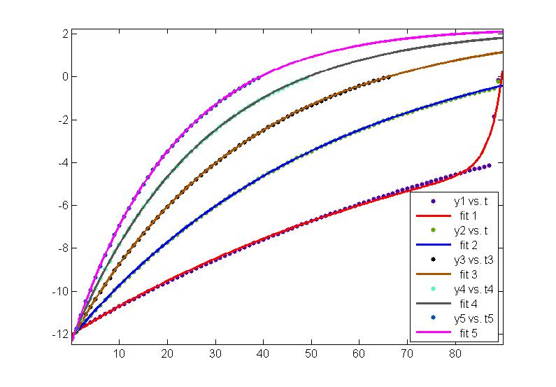 fit 1 General model Exp2: f(x) = a*exp(b*x) + c*exp(d*x) Coefficients (with 95% confidence bounds): a = 1.474e-014 (-8.61e-014, 1.156e-013) b = 0.3711 (0.2937, 0.4486) c = -12.03 (-12.15, -11.91) d = -0.0116 (-0.01188, -0.01132) Goodness of fit: SSE: 3.872 R-square: 0.9925 Adjusted R-square: 0.9923 RMSE: 0.2134 fit 2 General model Exp2: f(x) = a*exp(b*x) + c*exp(d*x) Coefficients (with 95% confidence bounds): a = 1.429 (0.8846, 1.974) b = 0.003835 (0.0009759, 0.006695) c = -13.6 (-14.13, -13.07) d = -0.01922 (-0.02002, -0.01843) Goodness of fit: SSE: 0.05904 R-square: 0.9999 Adjusted R-square: 0.9999 RMSE: 0.02636 .... |