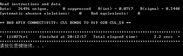 高手们帮我看一下吧,用shelxl解晶体,用xshell看晶体结构时,C55,O19,O20为一个芳环上的羧基,两个O与金属配位,而C56是芳环上连接C55羧基的C,不过分在这个链单元的两端,pack一下可以看到它们是连在一起的,这样加氢后,C55上竟然出现一个H,XL修时出现这样的报错,本人新手,拜求大侠们指点啊