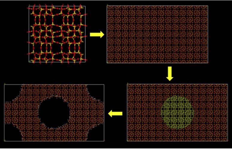 最近读了一篇文献,在母体骨架上挖孔,然后进行吸附或化学反应的模拟。如图所示 大家一起讨论讨论,如何在晶体上挖出一个规整的孔呢? 我想的方法是,1. Edit-Atom Selection-选择径向,然后删掉。但是,选中的不是筒状,而是以某一圆心的球状,然后我就改变好几次坐标,近似抠出一个圆筒。 2. 导出cif文件,根据a,b坐标,删去落在孔内的原子,但是很费时间,很累。 大家都是怎么处理的呢? |