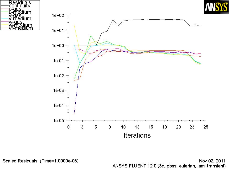 在ansys12的fluent中对流化床进行模拟时,计算刚开始就出现了残差曲线异常的现象,查看固相体积分数,也出现了异常,不知道是网格问题还是参数设置问题?网格用gambit画的,模型大小25*16*26mm。总网格数8万,采用先线网格,再面网格,最后体网格的方式画的,也采用过直接体网格划分方式试过,都出现这种问题……寻求有经验的砖家指点……谢谢!