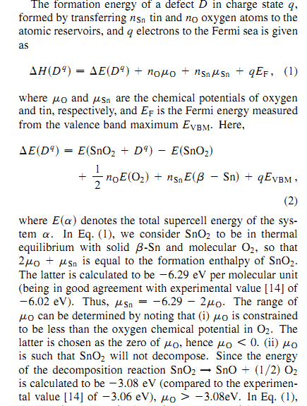 2uO+uSn=SnO2的形成焓,怎么回事啊? 这里要注意表达式中的含义。 某原子 i 的化学势可写为两部分:mu(i)=mu_i (0)+ delta_mu(i). 其中mu_i (0)就元子 i 在基态晶体构型下平均一个原子的能量,delta_mu(i) 是与环境有关的量。如果2uO+uSn=SnO2公式右边是形成焓,那么左边的 mu 是上面我说的公式中的delta_mu(i), 由这方程解出化学势后还需加上mu_i (0)才是缺陷形成能公式中所需的 mu。 如果2uO+uSn=SnO2公式右边是一个化学单元(fomula unit)的能量,左边的mu 就是mu(i)了。 |