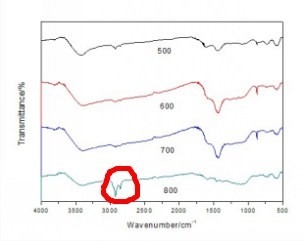 我做的的碳材料,不解的是随着碳化温度的增加,800℃下-CH2,-CH3的峰增强了??还是我分析的不对???800摄氏度的时候,为什么2923和2852cm-1 那边突然这么大???请教各位大神??~· |