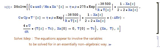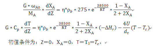 做一个反应工程的计算,但数学和编程的水平太差,现在有mathmatica7.0,求高手给个计算程序,采用的话再多送金币呵,方程如图片,是常微分方程的初值问题,其中G、ωA0、MA、η、ρb、R、Cp、∆Hr、Tc、U、dt均为常数,由我根据不同的条件计算得出,Z的计算范围再定,求大家帮忙,多谢! [ Last edited by dbb627 on 2011-11-9 at 10:11 ] |