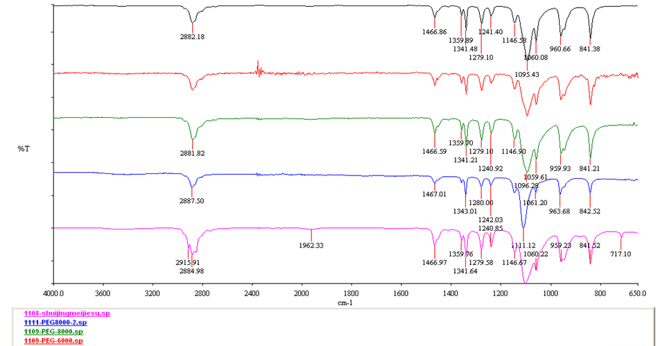 我是红外光谱新手,对于谱图的分析还一窍不通,按网上的有经验人士提供的方法好多峰值对不上,还请高手赐教,帮忙分析下这张光谱图,小女不甚感激! 此种物质商业名叫“水晶美洁素”——图上粉红色线,其它几种谱图与此种物质谱图一致。 |