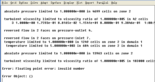 先谢谢您!现在我把网格数改小了,还是出现 7 8.9148e-01 2.8153e-02 1.4518e-02 6.8041e-03 1.1235e+00 1.3627e+00 0:04:17 993 reversed flow in 20 faces on pressure-inlet 7. temperature limited to 1.000000e+000 in 42 cells on zone 2 in domain 1 temperature limited to 5.000000e+003 in 46 cells on zone 2 in domain 1 absolute pressure limited to 1.000000e+000 in 4139 cells on zone 2 turbulent viscosity limited to viscosity ratio of 1.000000e+005 in 1 cells 8 3.6129e+00 1.9467e-02 1.5700e-02 8.3799e-02 1.0693e+00 2.9176e+01 0:03:25 992 reversed flow in 23 faces on pressure-inlet 7. temperature limited to 1.000000e+000 in 182 cells on zone 2 in domain 1 temperature limited to 5.000000e+003 in 380 cells on zone 2 in domain 1 absolute pressure limited to 1.000000e+000 in 805 cells on zone 2 turbulent viscosity limited to viscosity ratio of 1.000000e+005 in 33000 cells Error: Floating point error: invalid number Error Object: () |