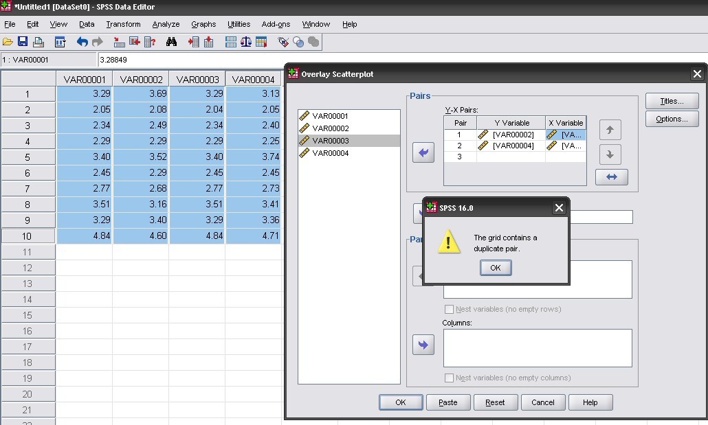 本人初学spss,想做一个散点图,就是如下图,以v1和v3为横坐标,v2和v4为纵坐标,选择那个overlay的选项,为什么总是提示,the gird contains a duplicate pair?