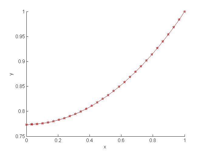 function Exercise110 clear all clc a = 0; b = 1; solinit = bvpinit(linspace(a,b,11),[0 0]); S = diag([0 -1]); % 奇异非线性微分方程组y' = S*y/x+f(x,y)的S矩阵,则ODEfun = f(x,y) options = bvpset('SingularTerm',S); % 设置奇异性参数S矩阵选项 sol = bvp4c(@ODEfun,@BCfun,solinit,options); x = 0:0.02:1; y = deval(sol,x); plot(x,y(1,,'ro-') xlabel('x') ylabel('y') function dy=ODEfun(x,y) dy1=y(2); dy2=2*y(1)/(1+y(1)); dy=[dy1;dy2]; function bc = BCfun(ya,yb) bc = [ya(2);yb(1)-1]; 如果一窍不通,请先看书学习回来再开口 2011-11-14 22:45:37 2 TA的主页 加收听 加好友 只看回帖 发短消息 送红花 引用回复 编辑 通知版主处理 dbb627 实习版主 (小有名气) 计算强帖: 2 听众: 9 红花: 5 贵宾: 0.012 金币: 2942.6 散金: 73 帖子: 231 在线: 194.3小时 虫号: 149791 注册: 2005-12-29 活跃: 2011-11-14 状态: 在线 性别: GG 专业: 污染控制化学 管辖: 计算模拟 【答案】应助回帖 注意,这里换了一个条件,dy/dx(x=0)=0 因为x=0 无意义 solinit = bvpinit(linspace(0,1,10),[5;1]); sol = bvp4c(odefun,bcfun,solinit); xint = linspace(0,1,30); yint = deval(sol,xint); hold on; plot(xint,yint(1,,'rp'); ??? Error using ==> bvp4c at 252 Unable to solve the collocation equations -- a singular Jacobian encountered CODE: [Copy to clipboard] odefun=@(x,y)[y(2);2*y(1)/(1+y(1))-y(2)/x]; bcfun=@(ya,yb)[ya(2);yb(1)-1]; solinit = bvpinit(linspace(1e-7,1,10),[5;1]); sol = bvp4c(odefun,bcfun,solinit); xint = linspace(1e-7,1,30); yint = deval(sol,xint); hold on; plot(xint,yint(1, ,'-rp');结果如图 |