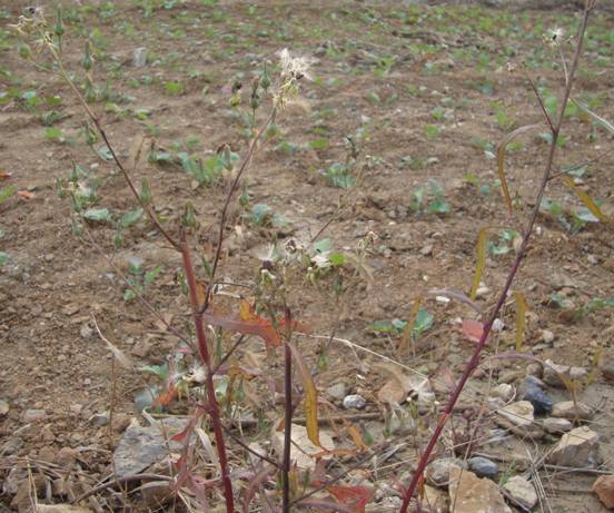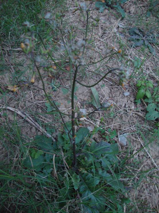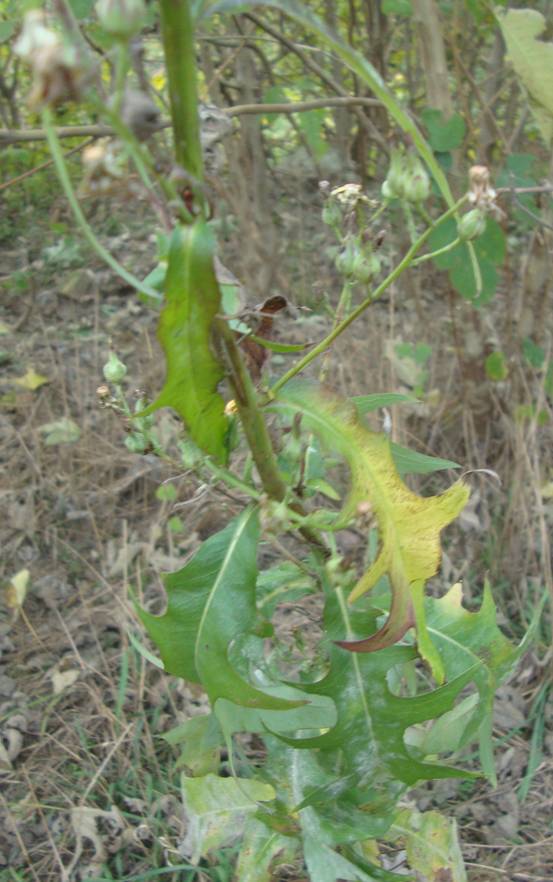 | 3 是山莴苣。山莴苣一年生或二年生草本。茎直立,高80~150厘米,被柔毛,上部分枝。叶互生,长椭圆状披针形,长10~30厘米,宽1.5~5厘米,不裂,或边缘具齿裂或羽裂;上面绿色,下面白绿色,叶缘略带暗紫色;无柄,基部抱茎;茎上部的叶呈长披针形。头状花序顶生,排列成圆锥状;总苞下部膨大,苞片多列,呈覆瓦状排列;舌状花淡黄色,日中正开,傍晚闭合;雄蕊5;子房下位,花柱纤细,柱头2裂。瘦果卵形而扁,黑色,喙短,喙端有白色冠毛一层。花期8~9月。果期9~10月。生长于路边、荒野。 |