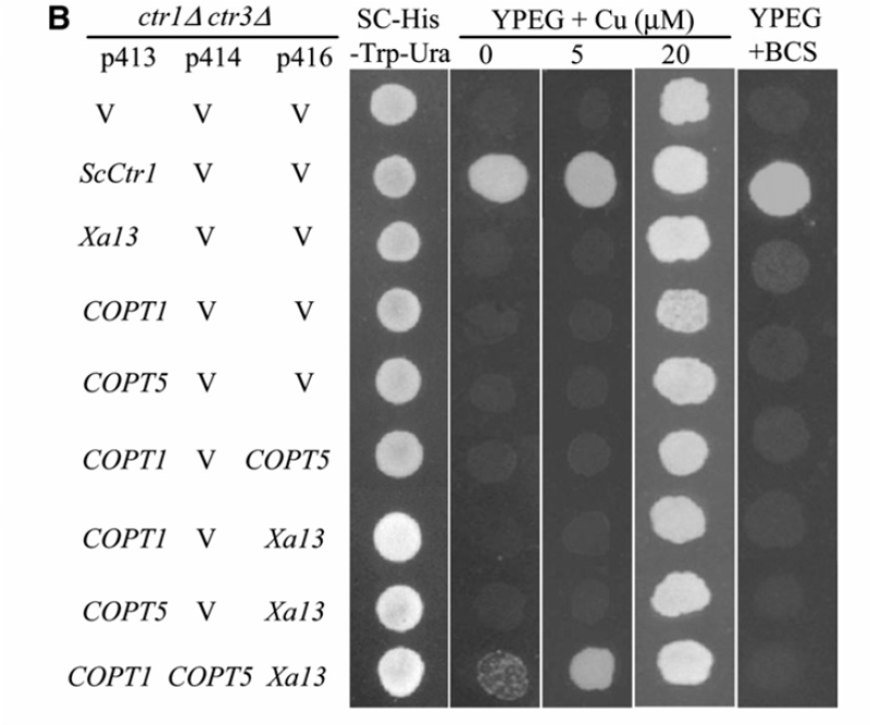 忘了补充图片中的一些注释了:Functional complementation of S. cerevisiae ctr1Dctr3D mutant (MPY17) by coexpression of Xa13, COPT1, and COPT5. Complementation is indicated by growth on the media with 0 or 5 mM Cu. The p413, p414, and p416 are yeast expression vectors. Yeast ScCtr1 and empty vector (V) were used as positive and negative controls, respectively. Transformants were grown in SC-His-Trp-Ura medium to exponential phase and spotted onto SC-His-Trp-Ura, ethanol/glycerol (YPEG), and bathocuproine disulfonic acid (BCS) plates. |