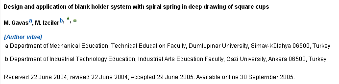 偶然看到这篇论文,被它的审稿周期震惊了! 如果所有期刊都能达到这个效率多好啊! ![]() ![]() ![]() Design and application of blank holder system with spiral spring in deep drawing of square cups M. Gavasa, M. Izcilerb, , Received 22 June 2004; revised 22 June 2004; Accepted 29 June 2005. Available online 30 September 2005. http://www.sciencedirect.com/sci ... i/S0924013605007442 |