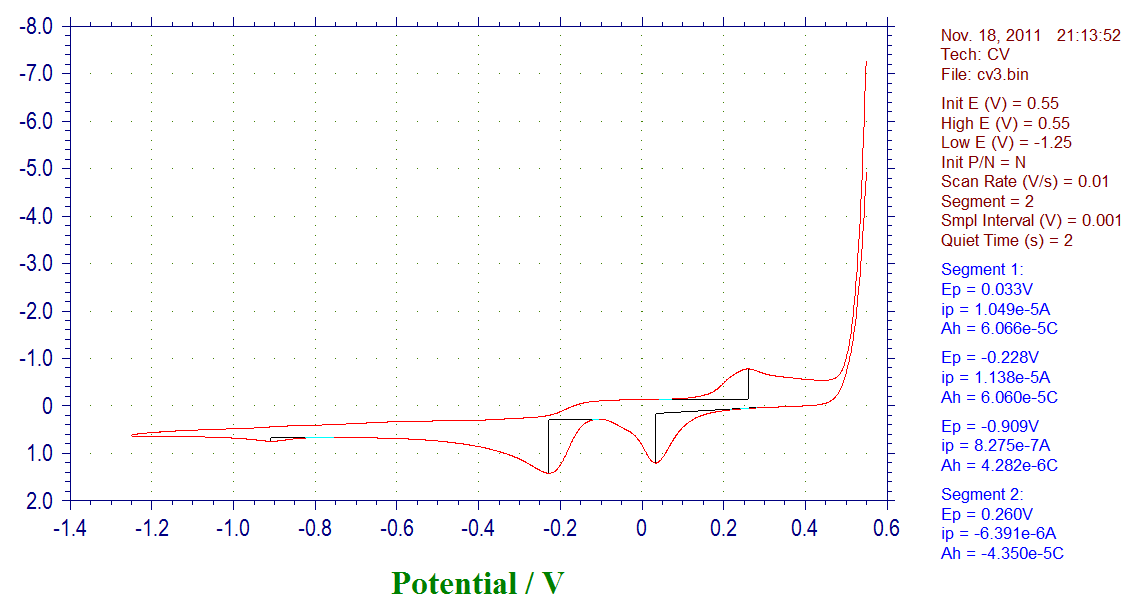 你上面有两对氧化还原峰,上面两个氧化峰应该分别对应Au-->Au+和Au+-->Au3+。下面的两个峰相反。你可以核对一下物理化学书后面的附表,在稍微计算下。