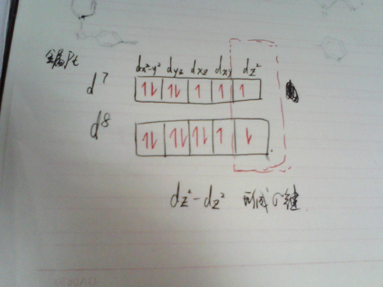 文献上的Pt是四配位的,要是它提供一个空的dx2-y2与空的s\px、py杂化,那么对于d7就有7个电子填充四个轨道就有一个轨道是半充满的,而d8的八个电子填充四个轨道是全充满的。。。目前,只能这么理解了~~~