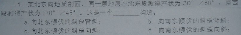 答案b,倾角不相等,造成斜歪,北东段倾角小于90,南西段倾角大于90,形成背斜,如果两个段换一下位置,就变成向斜了。然后你要知道褶皱倾伏的概念,简单点说就是就是枢纽在水平面上的投影所指的方向,知道了这些,大致比划一下两个产状交线(枢纽)的方向,应该是南东或北西方向。所以答案是b。