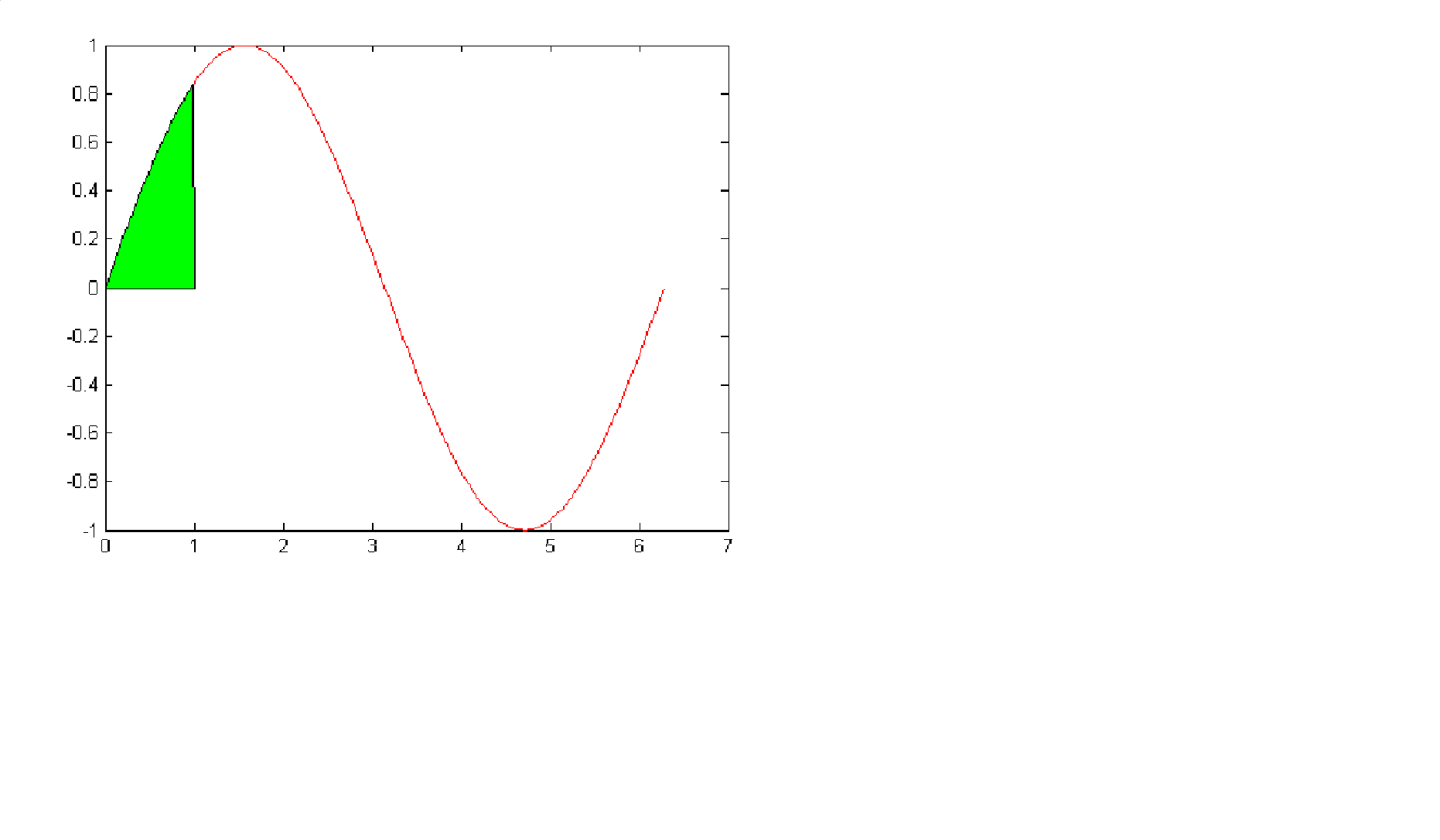 利用二维绘图函数patch,我们可绘制填充图.绘制填充图的另一个函数为fill. 下面的例子绘出了函数humps(一个Matlab演示函数)在指定区域内的函数图形. 例10:用函数patch绘制填充图 fplot('humps',[0,2],'b') hold on patch([0.5 0.5:0.02:1 1],[0 humps(0.5:0.02:1) 0],'r'); hold off title('A region under an interesting function.') grid 图4.1.6.1填充图 我们还可以用函数fill来绘制类似的填充图. 例11:用函数fill绘制填充图 x=0:pi/60:2*pi; y=sin(x); x1=0:pi/60:1; y1=sin(x1); plot(x,y,'r'); hold on fill([x1 1],[y1 0],'g') 图4.1.6.2填充图 |