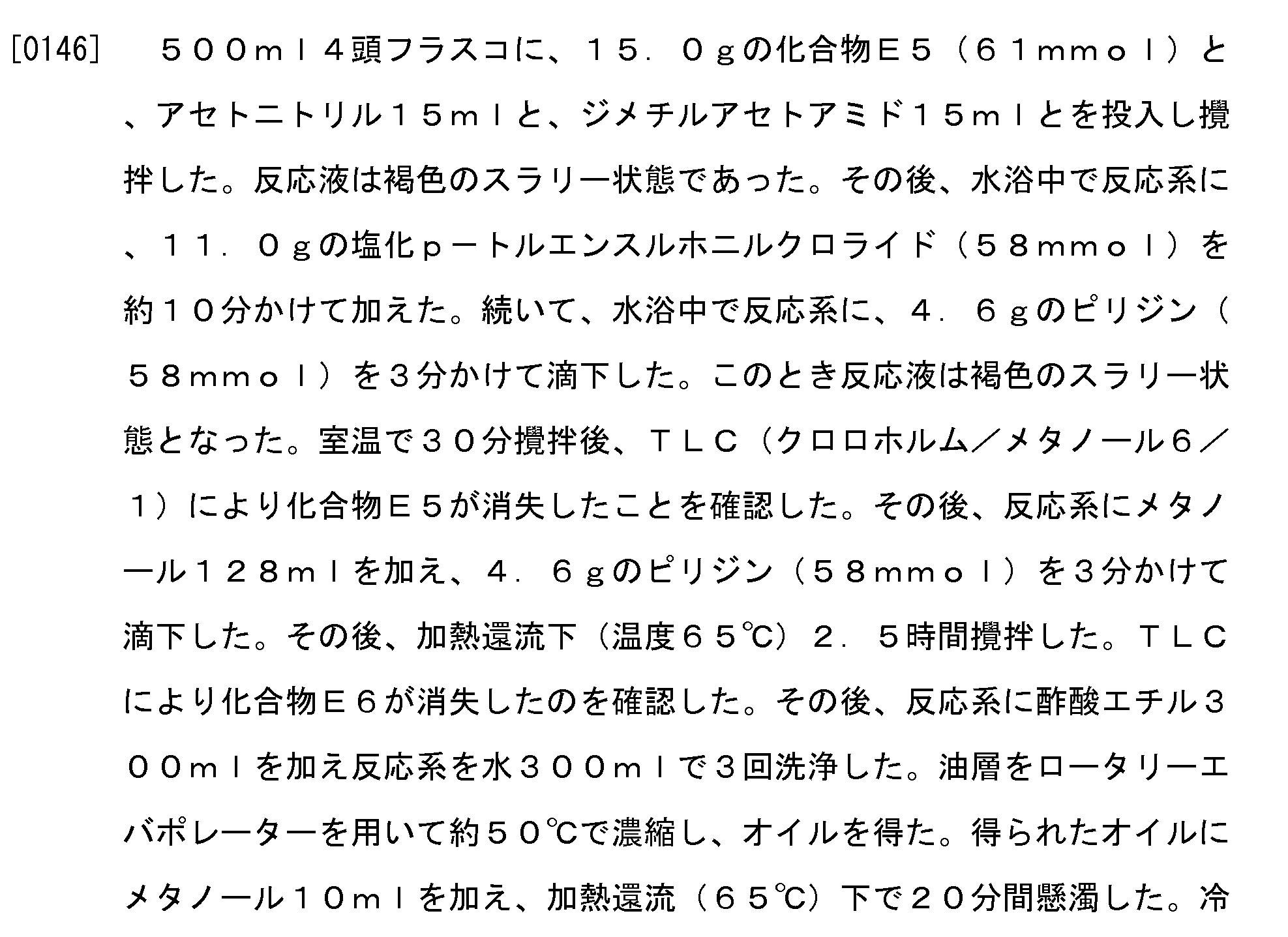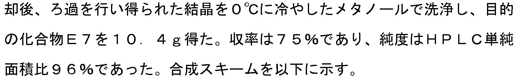 | 往500ml的四口烧瓶中加入15.0g化合物E5,乙腈15ml,二甲基乙酰胺15ml,搅拌呈褐色浆状物。水浴下,约10分钟分批加入11 .0g对甲苯磺酰氯,随后往里滴加4.6g吡啶,约三分钟滴完。此时反应液变为褐色浆状。室温搅拌30分钟后,TLC(氯仿-甲醇=6:1)确认E5消失。往里加入甲醇128ml,随后往里滴加4.6g吡啶,约三分钟滴完。加热回流(65度)2.5小时。TLC确认E6消失。往反应体系里加入乙酸乙酯300ml,然后水洗3×300ml,有机层用旋蒸(约50度)浓缩,得到油状物。加入10ml甲醇,回流(65度)20分钟,变浑浊。冷却,过滤得到的晶体用冷至0度的甲醇洗涤。得到10.4g目标化合物E7。收率75%,HPLC面积归一法纯度为96%。合成示意图如下。 |