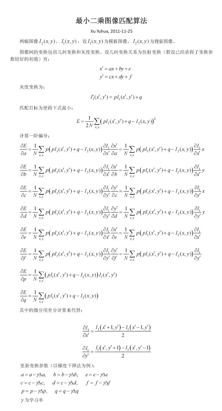 2011-11-22 各位虫子,帮忙看看我推导的最小二乘匹配是否有问题?谢谢! 假设以最简单的梯度下降法迭代求解仿射变换参数。 2011-12-01 该问题已解决。梯度下降法收敛太慢了。高斯牛顿法收敛速度够快。 [ Last edited by yuhua4 on 2011-12-2 at 00:00 ] |