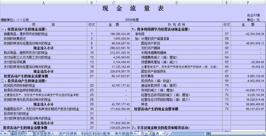 ![]() 用Excel编写的财务公式流程表。 里面包括基本信息录入、资产负债表、利润及利润分配表、表外数据录入、现金流量表等财务相关的报表,只需在相应位置输入数据即可得到财务报表啦~ ![]() [ Last edited by viridwind on 2011-11-22 at 18:31 ] |