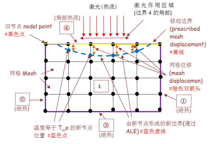 如果材料达到去除温度T_e(蒸发温度或熔化温度)就会被去除,则新边界形成。相关文献大都采用ALE对这个移动边界进行处理。