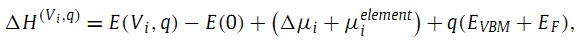 q是用于反应物和产物电荷数目不相等的情况。若是相等,q=0,就变成常见的形成能公式了。 如果电荷不相等,比如产物中多了q个电子,那么需要在形成能中考虑这q个电子的贡献,一般要减去反应物中q个电子的能量,也就是用q乘以反应物的费米能级。 至于这个费米能级的取值,一般要参考具体的反应物、反应条件来决定。但应该不是任意的,我想文章中应该提及费米能级为何取在这个范围吧(比如标志出的0.14eV可能就刚好对应了在某反应条件下,反应物的费米能级吧)。 至于公式中的其他参数,最好给出文章中对公式具体的描述,比如有时侯公式的Ef是相对与某个特定能级的,因此公式中可能会出现这些特定能级的加加减减。如果没有具体描述,很难正确理解 |
