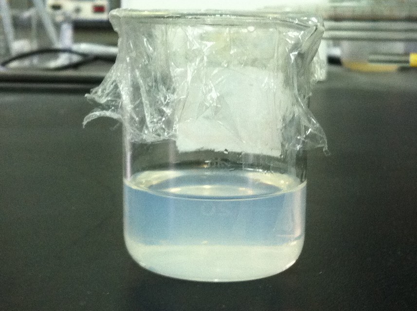 本人最近在用溶胶凝胶法制备ZnO量子点。具体步骤是将二水醋酸锌与一水氢氧化锂分别溶于乙醇中(醋酸锌溶液加入PVP),然后冷却到0度,再将氢氧化锂逐滴加到剧烈搅拌的醋酸锌乙醇溶液中。滴完了,应该生成的是澄清透明的ZnO溶胶。可我做的却不是完全透明的,如下图,并且拿去测UV-VIs光谱在400nm以上总是有一点吸收(0.001左右)。不知道是不是我制备的条件有些问题,还望做过此类合成的虫子们交流下。 |