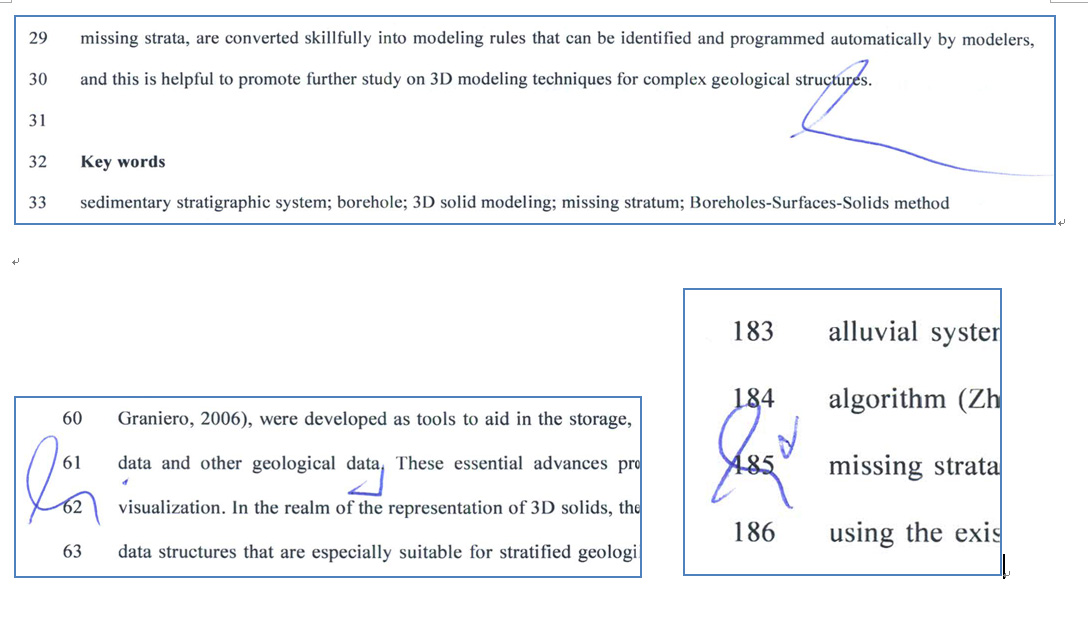 今天收到论文的评阅意见,评阅人(大概是一个美国人)直接在打印稿上手写了修改意见,非常认真仔细。只是评阅人写的一个符号(如下图,蓝色手写的符号),看不明白什么意思,而且是多次出现。请了解这个符号的虫子帮忙解释一下是什么意思?多谢了! |