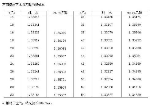 多数液态有机物质当温度每增加时,折射率降低 折射率是温度的函数 比如:水的, 温度℃ 折射率nD 0 1.33395 5 1.33388 10 1.33369 15 1.33339 20 1.33300 21 1.33290 22 1.33280 23 1.33271 24 1.33261 25 1.33250 26 1.33240 27 1.33229 28 1.33217 29 1.33206 30 1.33194 35 1.33131 40 1.33061 45 1.32985 50 1.32904 55 1.32817 60 1.32725 |